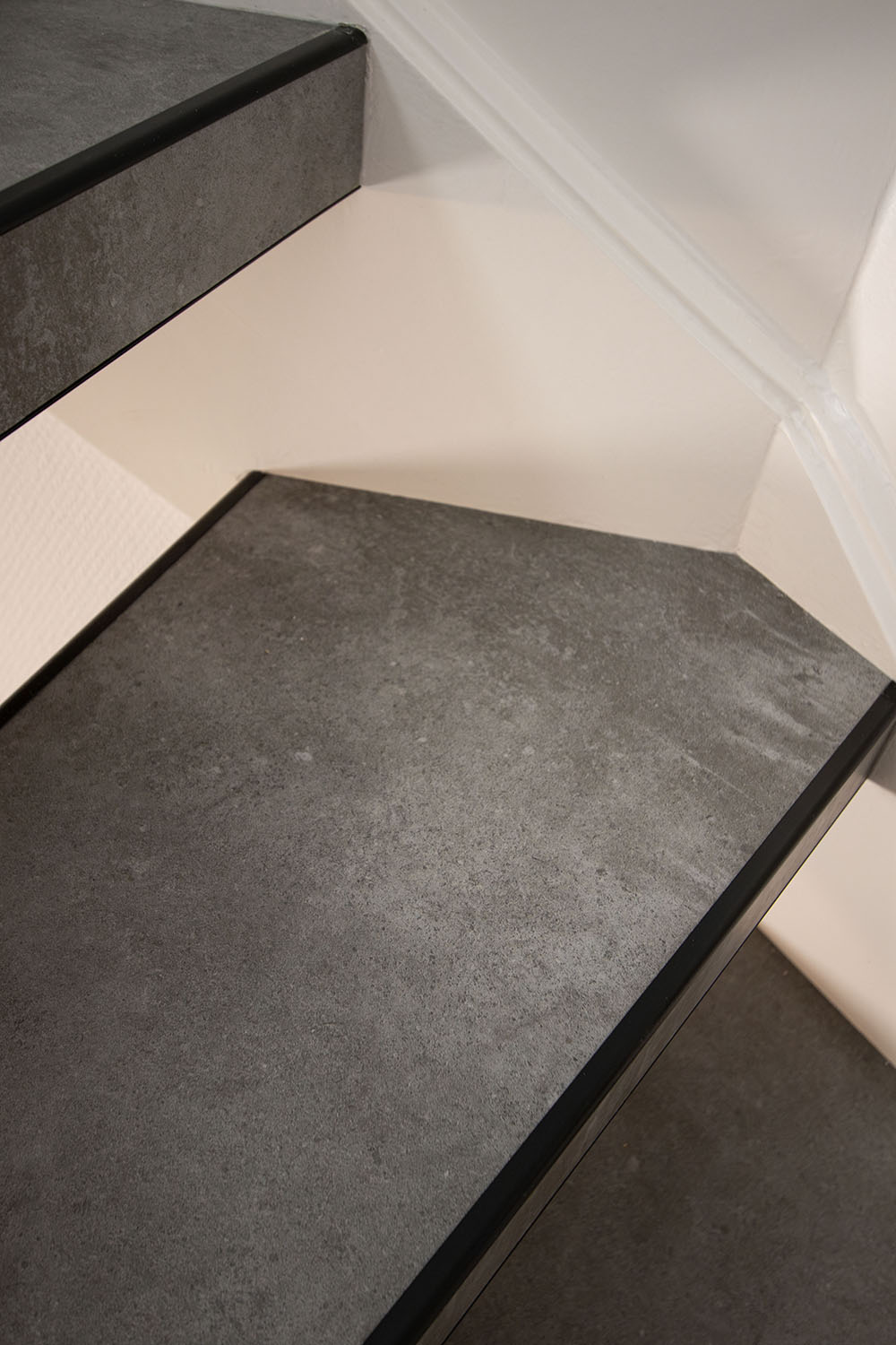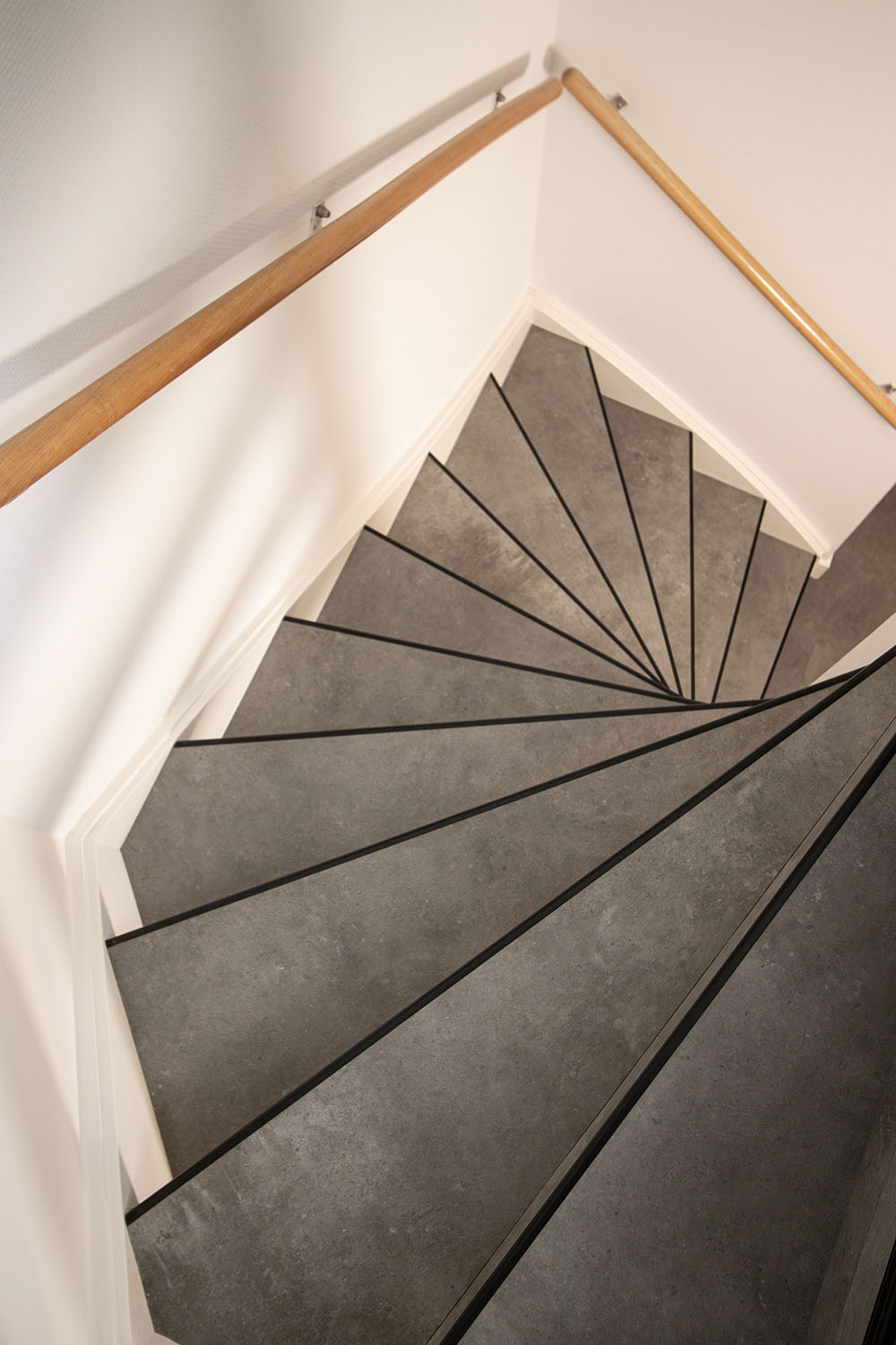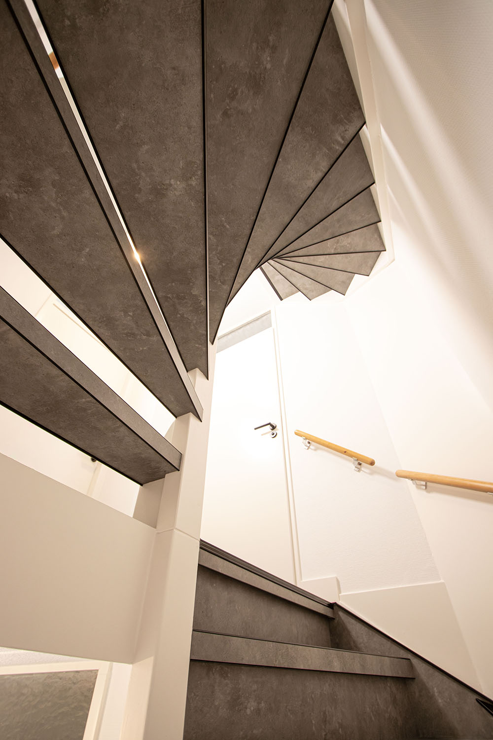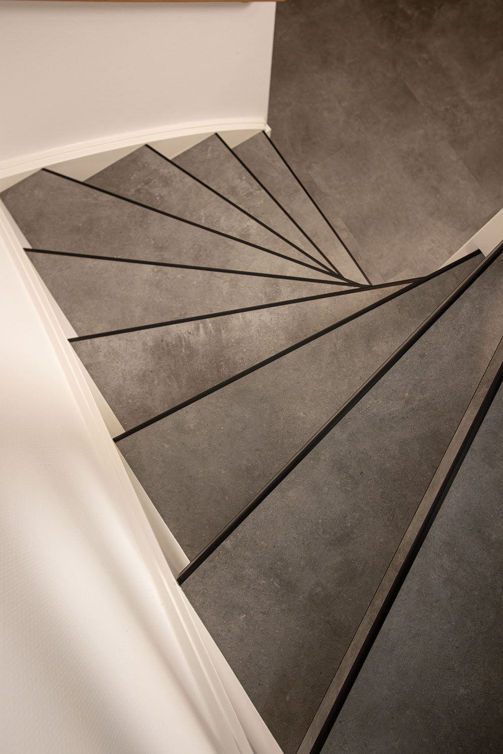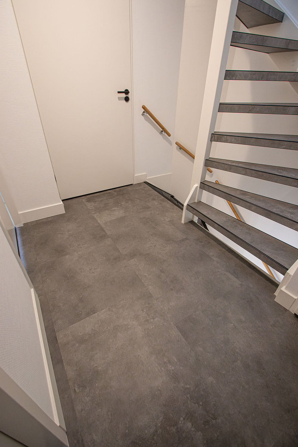 Voor deze woning in de regio was de grijze tint een schot in de roos. Het brengt rust in de hal en vormt een prachtig contrast met zowel lichte als donkere muren. Daarnaast is het materiaal uiterst duurzaam. Een trap wordt dagelijks intensief gebruikt, maar dankzij de sterke toplaag van dit materiaal blijven de treden jarenlang als nieuw, zonder dat er intensief onderhoud nodig is.